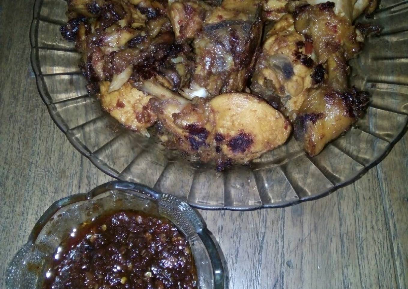 - Lumuri ayam yang sudah matang dengan sisa bumbu ungkep tadi, bakar di atas teflon sampai selesai.