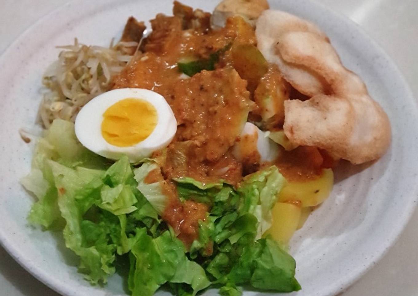 - Siram saus kacang,taburi bawang merah goreng,tambahkan kerupuk udang,emping dan telur rebus