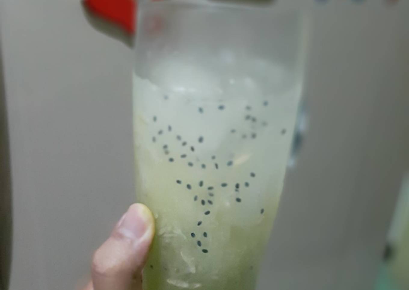 - Tuang sirup melon dalam gelas, kemudian tuang selasih secukupnya dan parutan timun. Tambahan air dan es batu