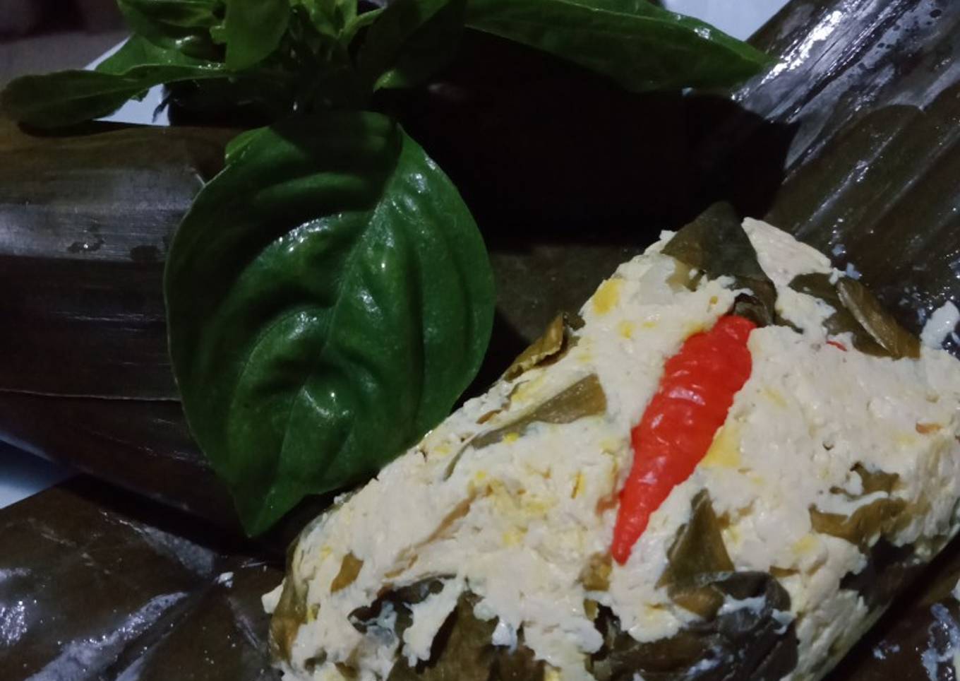 - Masukan adonan tahu ke atas daun pisang, tambahkan rawit di atas nya lalu bungkus