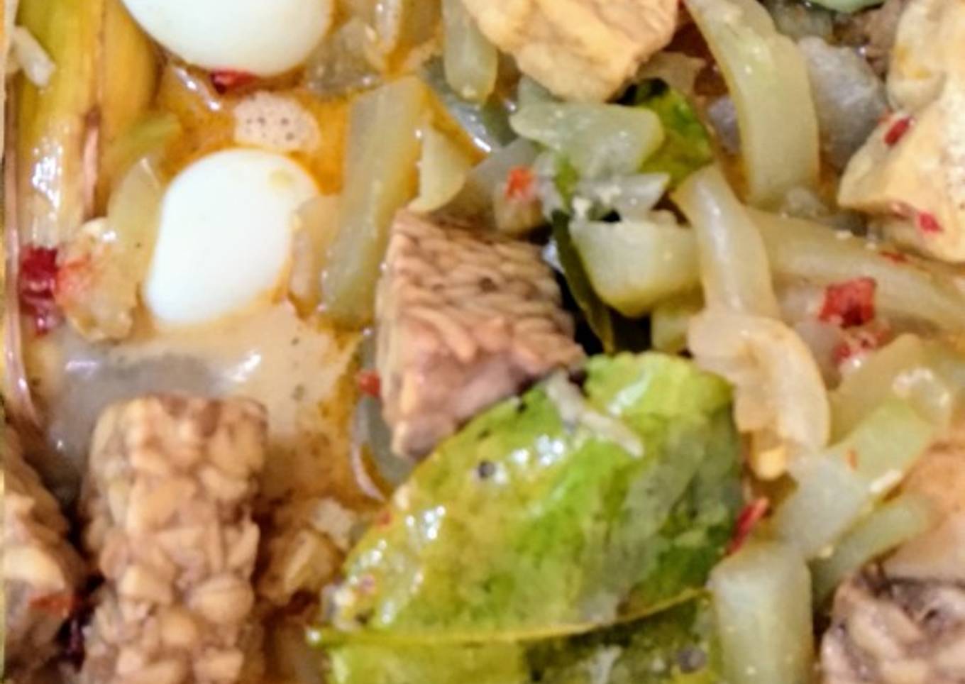 - Tumis bumbu halus sampai harum. Masukkan sere, daun salam, jeruk purut. Kemudian masukkan tahu, tempe dan labu siam. Beri 500ml air. biarkan sampai mendidih.
