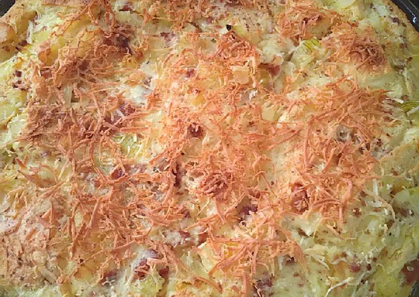 - Masukan susu, tambahkan garam, lada, parutan biji pala..aduk rata. Tambahkan keju, aduk rata. Matikan api. Tambahkan kocokan telur, aduk rata.