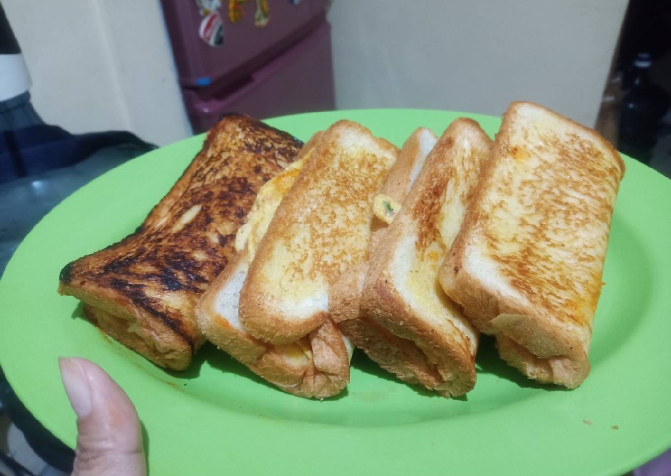 - Panggang hingga bawah roti kecoklatan. Tekan sedikit tengah roti dgn spatula agar mudah dilipat. Lalu lipat roti. Angkat. Lakukan hal yg sama pada sisa roti lainnya.