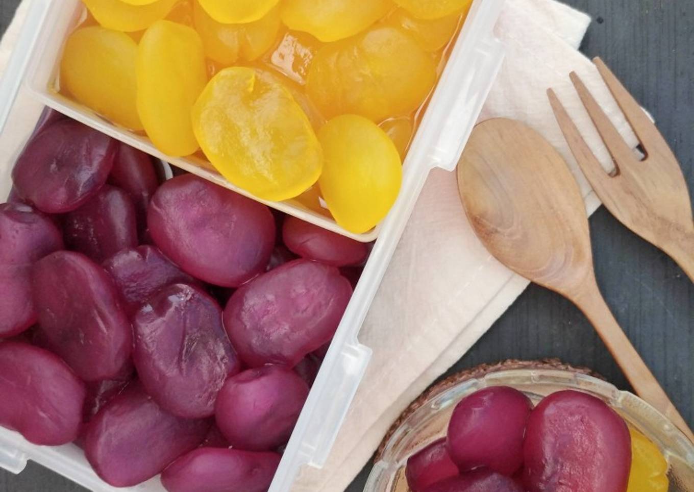 - Siapkan semua bahan lalu masak kolang-kaling dengan 2 panci secara bersamaan. Yang satu menggunakan nutrisari, gula, daun jeruk, daun pandan dan 2 tetes pewarna kuning, yang satu lagi sirup rasa anggur, gula, daun jeruk, daun pandan dan 2 tetes pewarna ungu. Masak hingga air gula menyusut, matikan kompor lalu diamkan hingga dingin sebelum dipindahkan ke dalam wadah agar warnanya meresap.