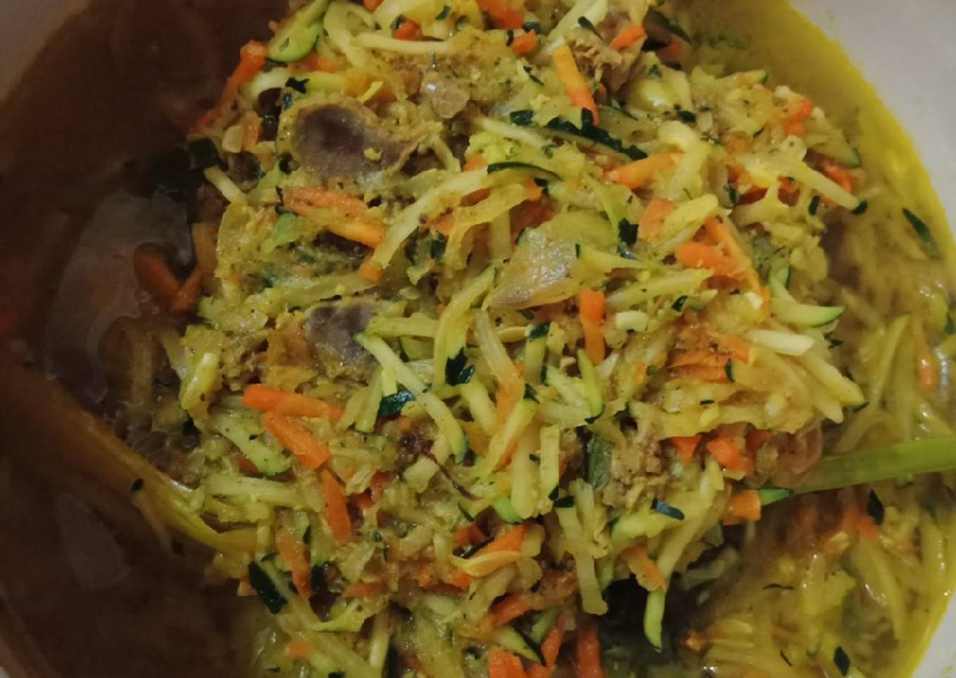 - Zuccini dan wortel parut dimasukan, aduk rata dan ditambahin air, masak sampai zuccini dan wortel matang.