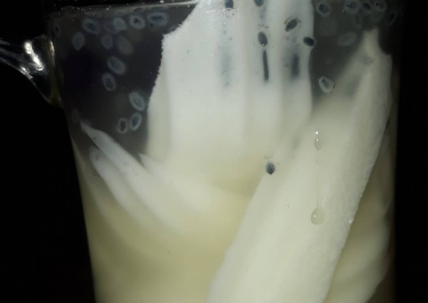 - Masukkan 12 SDM susu kental manis kedalam gelas beri air sisanya tadi 350 ml,aduk hingga susu larut.