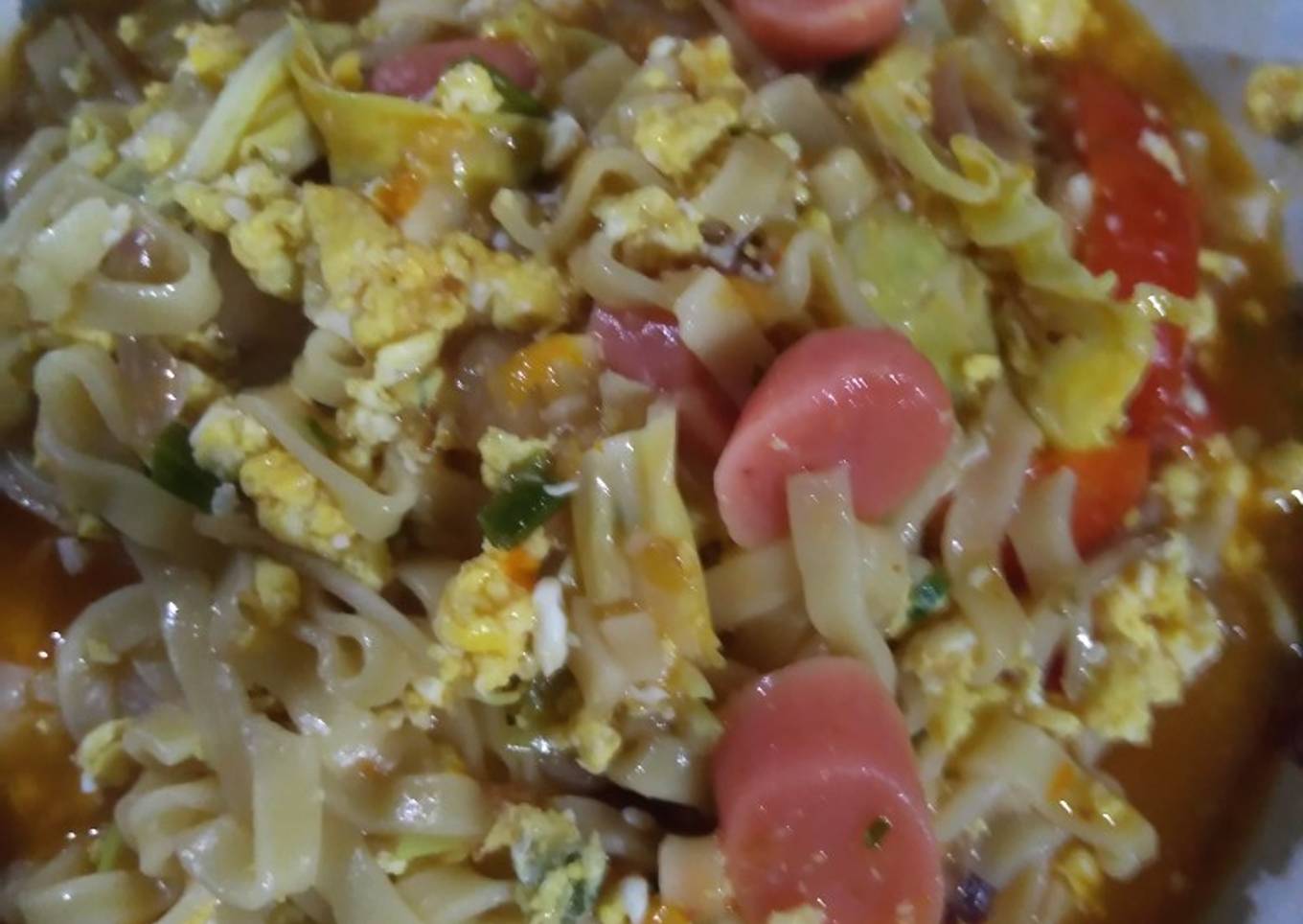 - Tuang air secukupnya, masukkan mie dan krupuk yang sudah di rebus, tambahkan lada,garam, bumbu mie, koreksi rasa, jika di rasa sudah pas matikan api, tuang ke mangkuk.