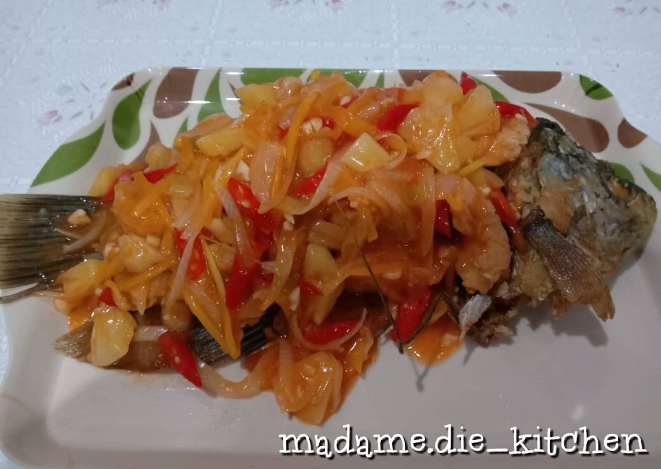 - Taburi saus asam manis pedas diatas susunan daging gurame dan sajikan